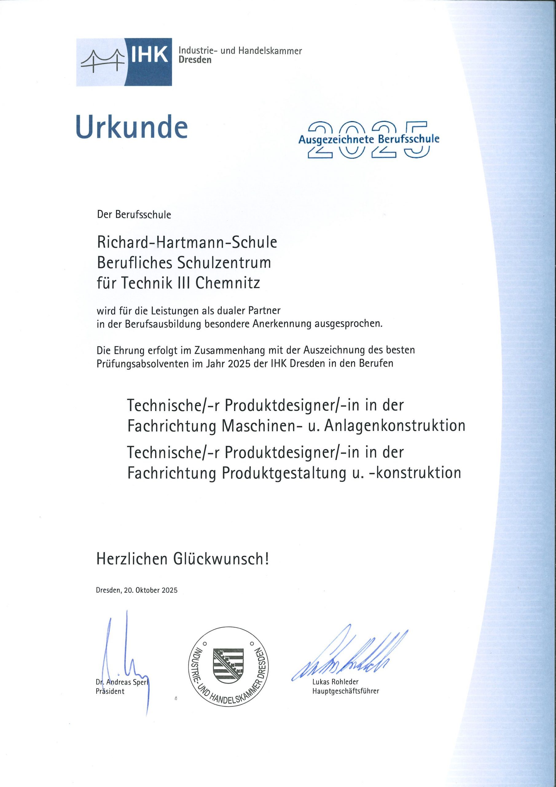 Wir sind stolz, als dualer Partner in der Berufsausbildung in Anerkennung unserer Leistungen in Dresden ausgezeichnet worden zu sein. Diese Ehrung bestätigt unser gemeinsames Engagement für praxisnahen Unterricht, innovative Lernformen und eine tatkräftige, zukunftsorientierte Schulgemeinschaft.